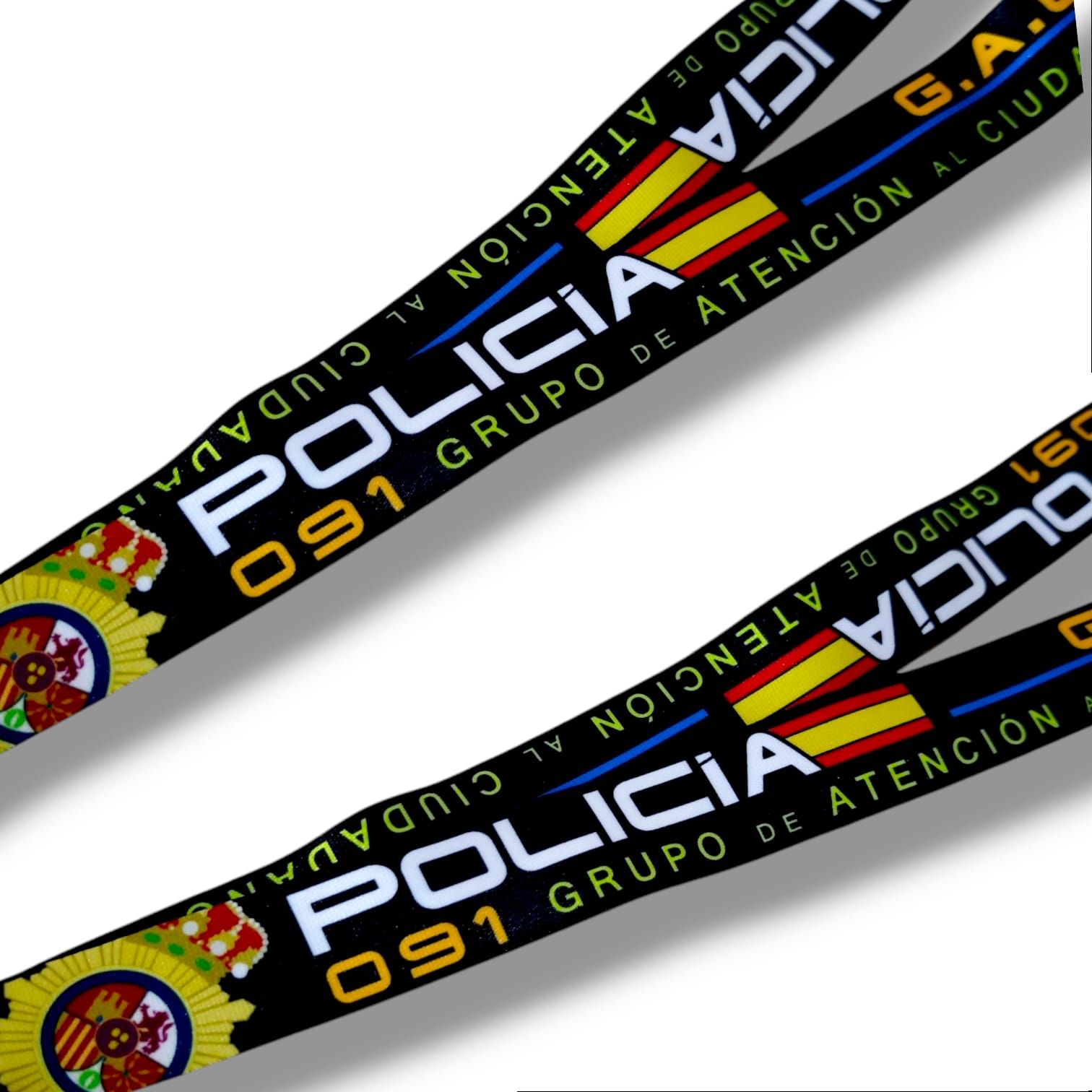 Lanyard de alta calidad y detalle en resistente poliéster con accesorio mosquetón metálico de los GAC (Grupos de Atención al Ciudadano) de la Policía Nacional.