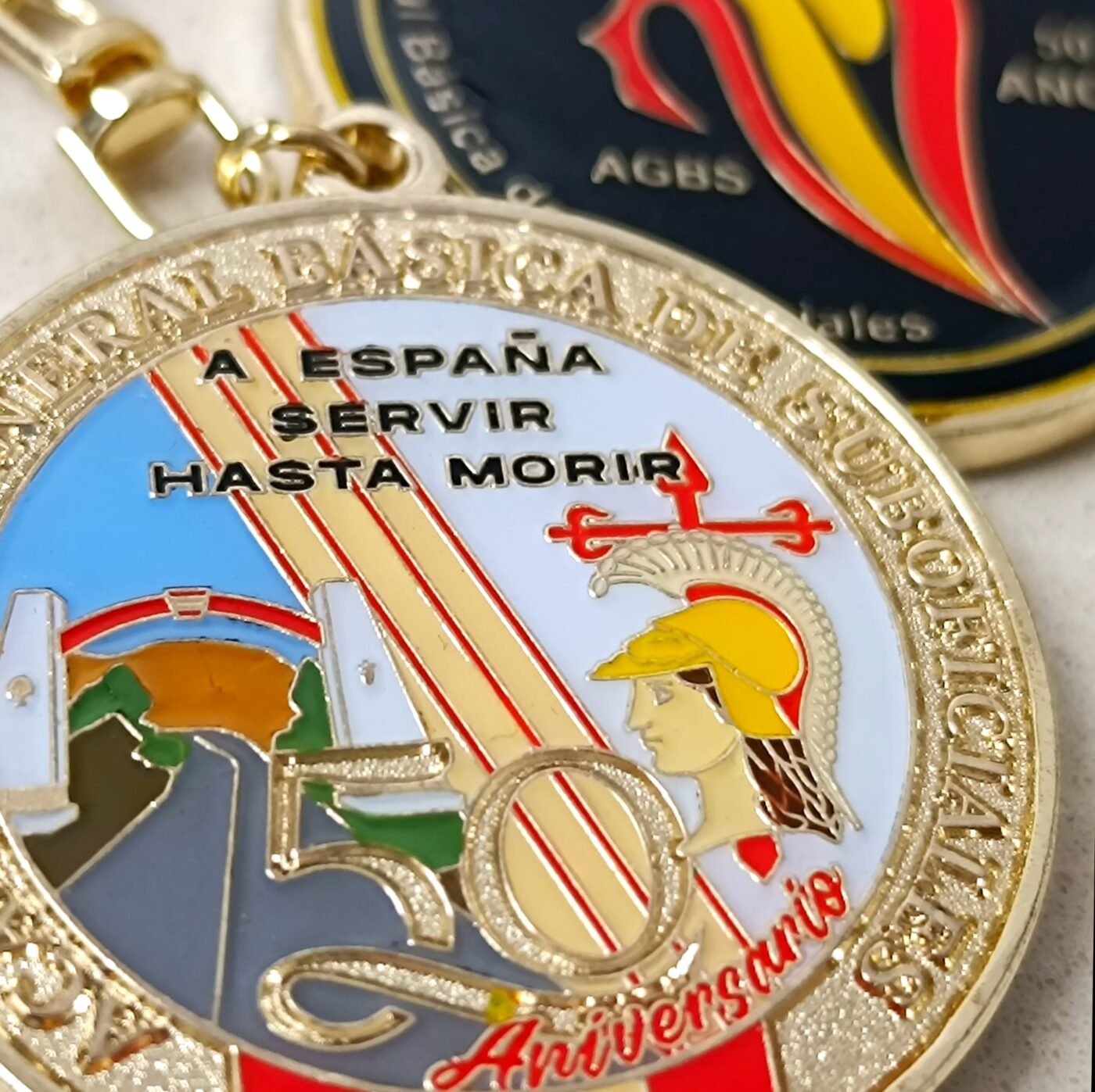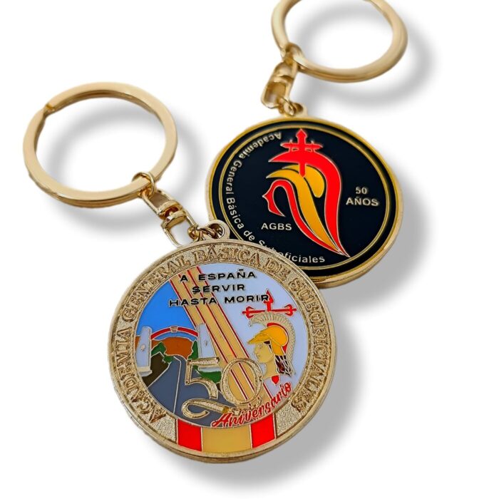 Llavero 50 aniversario AGBS (Academia General Básica de Suboficiales) edición especial, en metal dorado, 40 mm, esmalte de alta calidad con diseño original registrado y escudo de la marca Ejército de las Fuerzas Armadas.