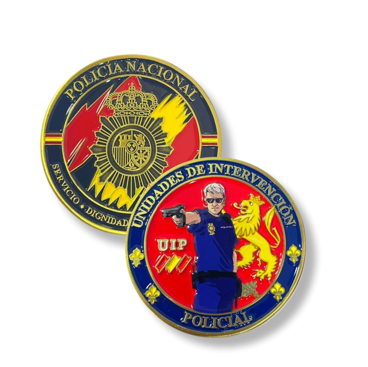 Moneda con diseño original de las Unidades de Intervención Policial (U.I.P.) de la Policía Nacional. Fabricada en 4 cm, sus esmaltes a color y el acabado en níquel le otorga un brillo especial, y la pintura con detalle le agrega un toque de autenticidad y elegancia.
