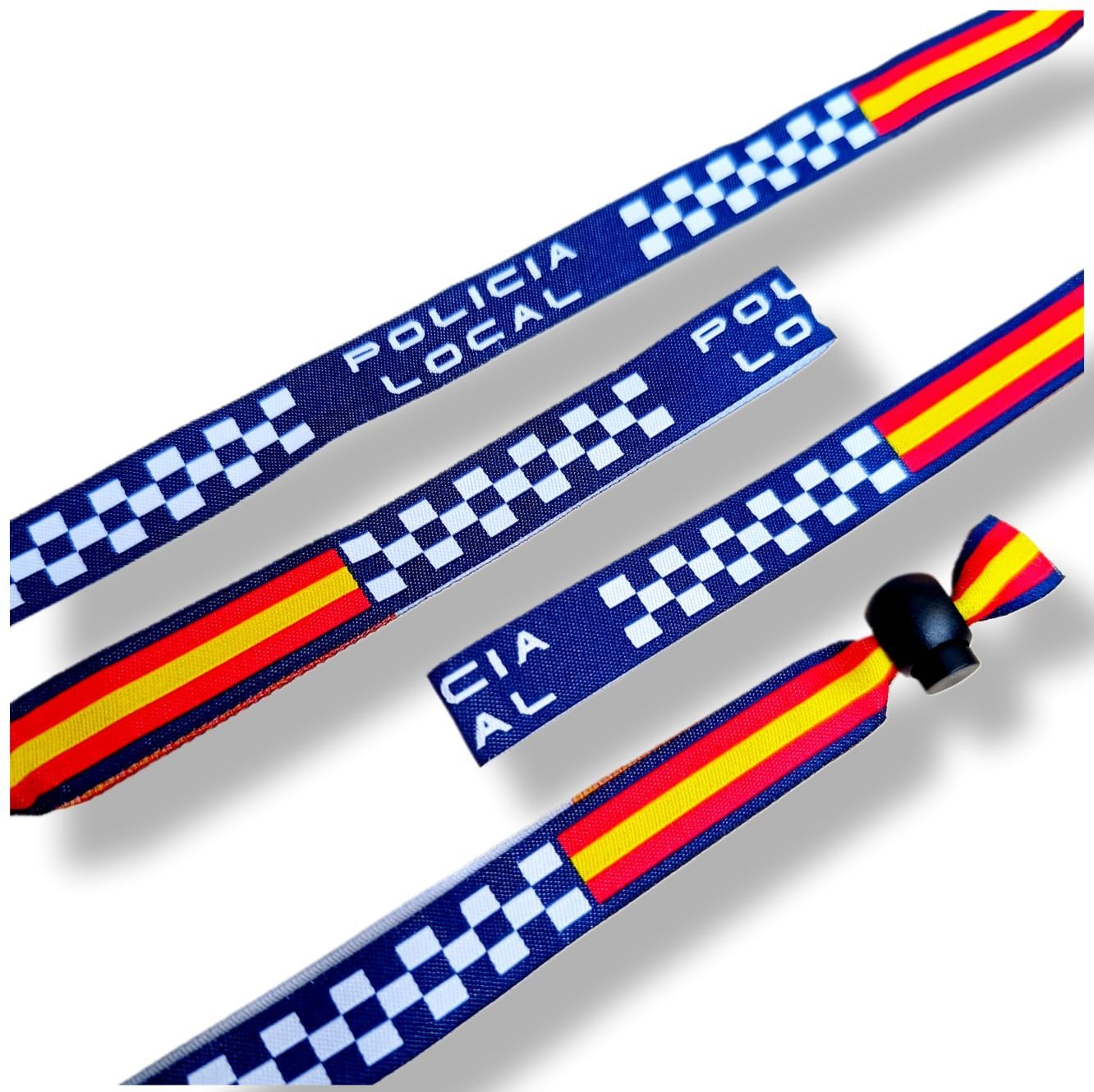 La Pulsera tela Policía Local está hecha en tela tejida de alta calidad y detalle. En el centro, la descripción “Policía Local” con cebreado cuadrado característico en blanco.
